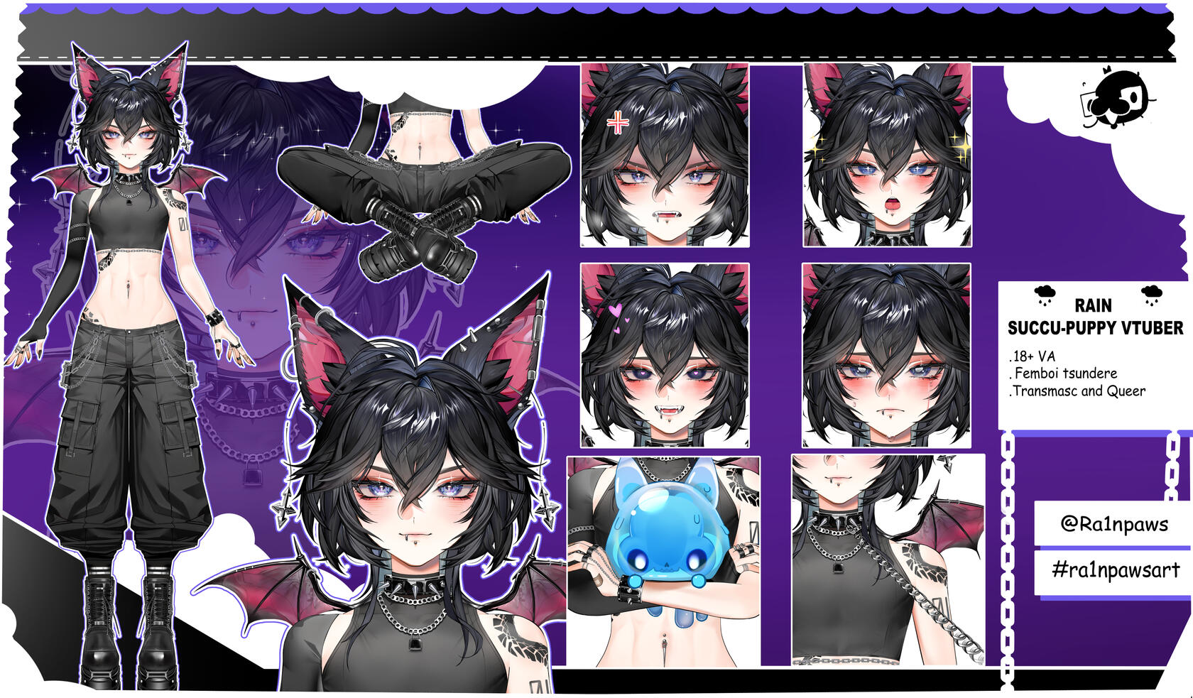 Heyo! I am a transmasc/queer/pansexual femboy content creator that loves gaming and doing NSFW/SFW VA work! I also have tons of fun streaming...Might or might not have an addiction of comissioning art of my Vtuber...I also have a severe addiction to rock-climbing, rip my fingies.Vtuber Lore? Your cutie brat (that might be a bit tsundere) femboy. He is a mix between a Succubus and a Puppy (Chihuahua). But he likes being at home, so instead of finding victims outside in the world, he found another way. Draining people over the internet using audios! Manifesting any excess energy into his lil slimes to suck out later. So now he comfortably drains people long distance while snuggling his slimes.Oshi Mark:⛓️🌧️